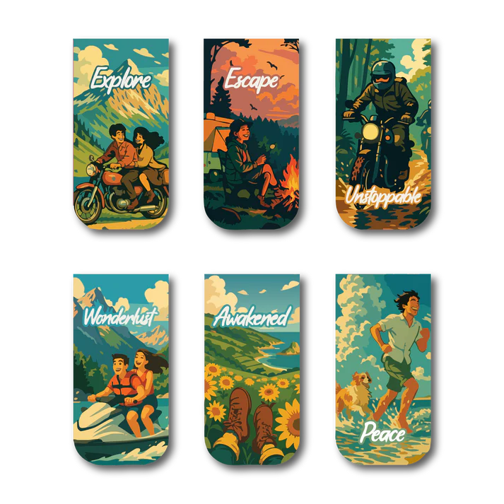 Fuel your wanderlust with our Adventure Vibes Magnetic Bookmark Set – a vibrant collection of 6 bookmarks inspired by the thrill of the outdoors and the joy of freedom. Whether you're curled up with a travel memoir or diving into your next epic read, these strong magnetic bookmarks will keep your place in style.