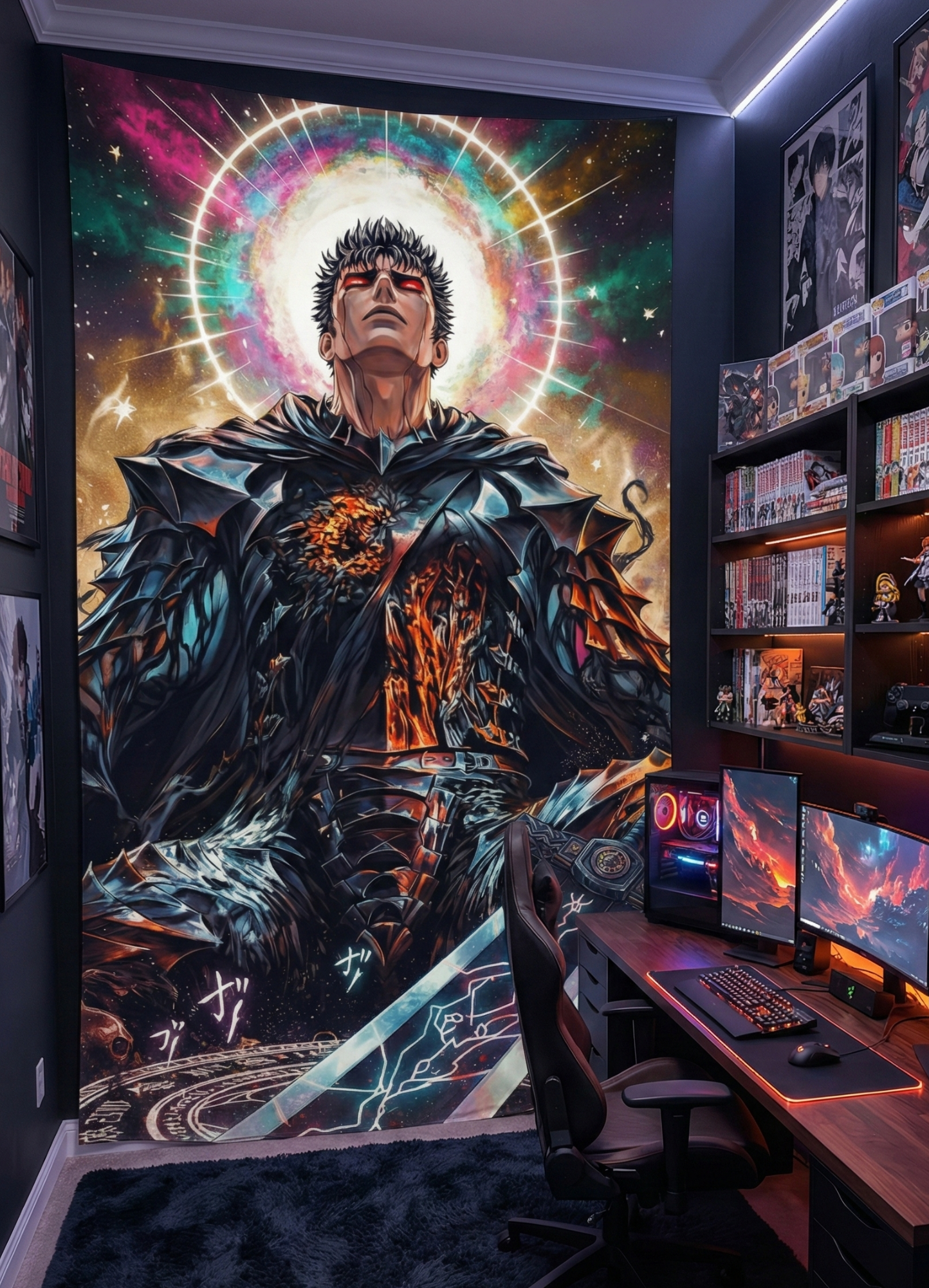 Dark fantasy anime warrior wall tapestry in modern gaming room