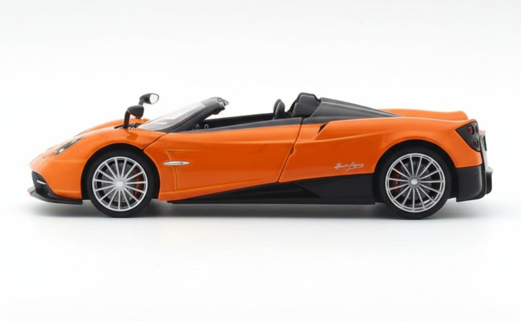 - 1:24 scale model, approximately 22 cm × 8 cm × 6 cm replicates the real Pagani Huayra Roadster’s proportions.